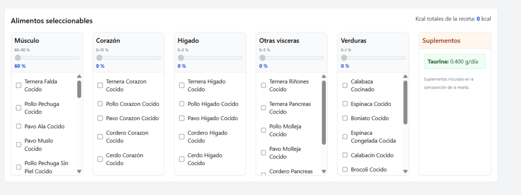 Por último se encuentra el grupo de los suplementos, se calculan automáticamente taurina, calcio y omega-3.