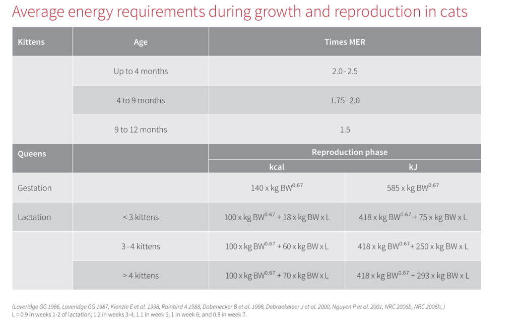 FEDIAF establece distintos valores de MER en función de la etapa de vida y del estilo de vida del gato.