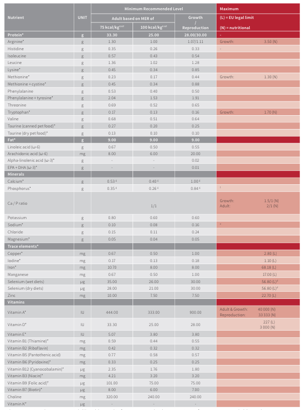 En esta columna se muestran los valores mínimo recomendados de cada nutriente. Cada nutriente se ajustará al requerimiento de kcal que tu gato necesita. En el ANEXO III está la tabla original de FEDIAF 2025, donde están los mínimo requeridos por 1000 kcal para cada etapa.