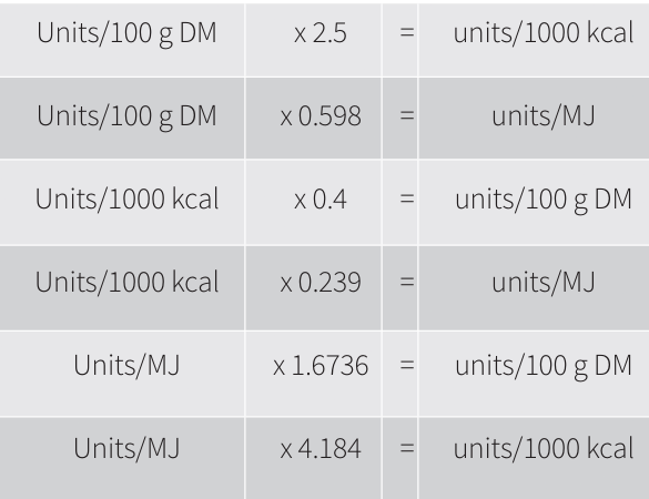 En la tabla está expresado de las dos formas, por kcal o en cantidades de materia seca MS, el que lleva MS entre paréntesis. El primero nos indica la cantidad con respecto al mínimo que hay que alcanzar, el segun (MS) el límite que no podemos superar.