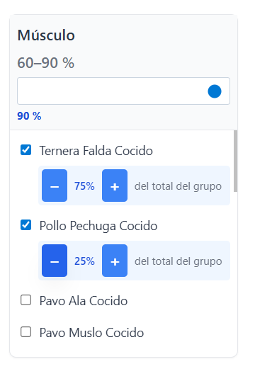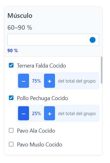 Si elijes varios alimentos de un mismo grupo, músculo por ejemplo, podrás elegir qué porcentaje quieres que se incluya de cada uno. Por ejemplo, puedes elegir que un 80% sea de pechuga de pollo y el otro 20% de lomo de cerdo.