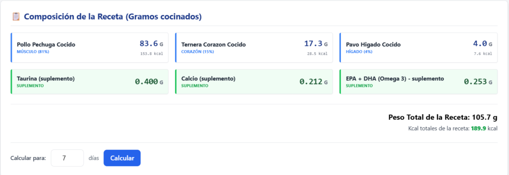 Esta es la calculadora “Catubelo Recetas Todo Cocinado”, que he creado para elaborar recetas de comida totalmente cocinada para gatos, ya sea como alimento húmedo complementario o como dieta completa.