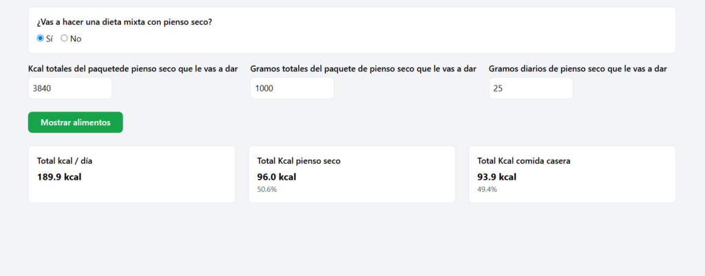 Esta pregunta es clave, ya que determina si la receta se utilizará como dieta completa o como parte de una dieta mixta junto con pienso seco.
