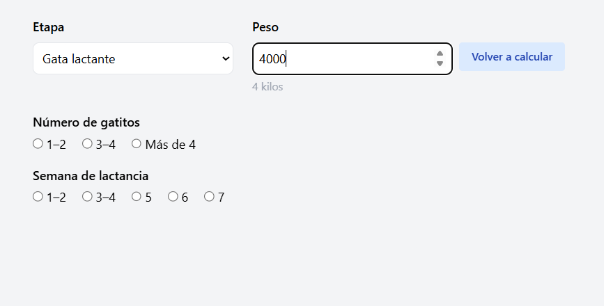 El cálculo de las necesidades energéticas se basa en los estándares de FEDIAF (Federation of European Pet Food Industry), teniendo en cuenta el peso y la etapa de vida del gato: crecimiento, adulto en mantenimiento, gestación y lactación.